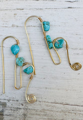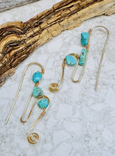 Handcrafted gold wire swirl earrings with vibrant turquoise stones — lightweight, playful, and one-of-a-kind.