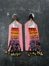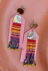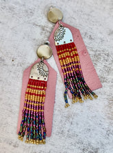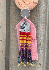 Pink leather earrings with silver accents and rainbow beaded fringe.
