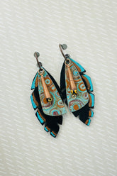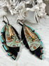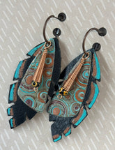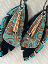 Bold, earthy, and full of soul. These earrings bring together hand-painted repurposed metal, layered black leather, and a copper-wrapped Tibetan agate bead for a look that’s equal parts edgy and bohemian.