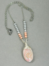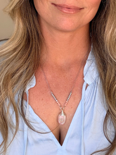 Above the stone, a handcrafted cone and bail connect the pendant to the chain — both sculpted from the same wire for a unified, artisan finish. The chain itself is detailed with 10 Czech glass beads on each side, alternating soft blush and metallic tones that reflect the subtle elegance of the stone below.