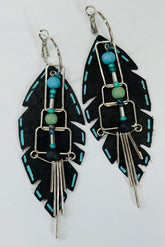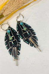 Midnight Feather earrings are made for the dreamers, the wanderers, and the ones who love their jewelry with a story. This pair starts with a hand-cut piece of black leather, shaped into feathered layers that move as you do. Delicate turquoise stitching is drawn by hand across the edges—no machine-made perfection here, just a touch of artisan character that makes every pair unique.